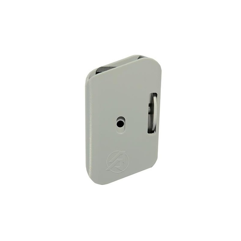 El anclaje al cinturón se realiza con una paqueña placa de aluminio para reducir la separación entre el cinturón interior y exterior.  Se puede ajustar lateralmente para que cada tirador encuentre el ángulo correcto con tan solo un tornillo.