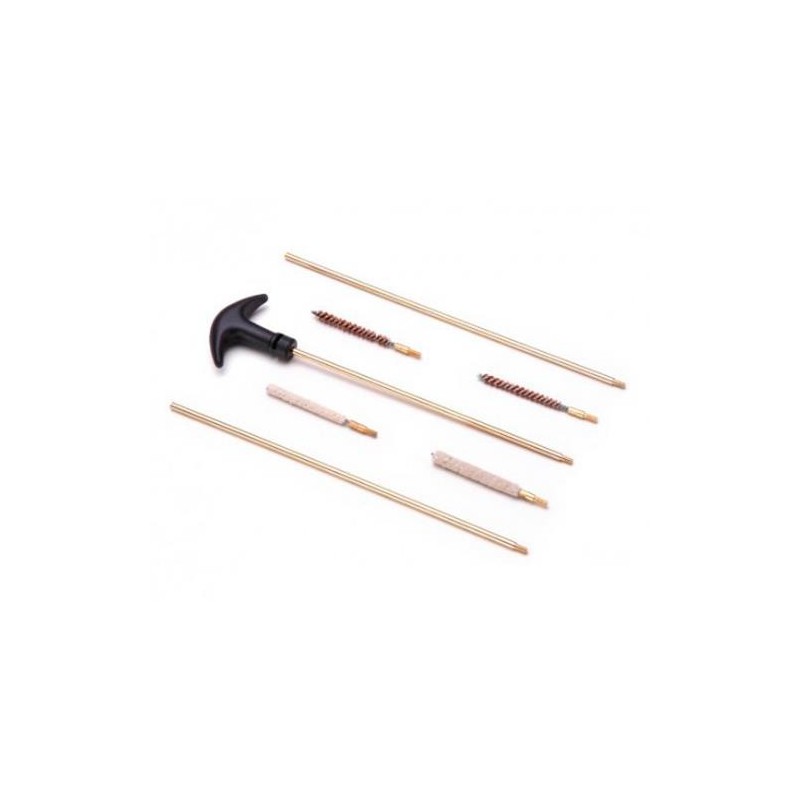 Kit de limpieza para la conservación y limpieza de su arma del cal. 4.5 que incluye: Varillas de metal con mango de plástico tipo T 2 escobillas de latón 2 escobillas de algodón Parches de limpieza  Medidas blister:31 x 10,5cm