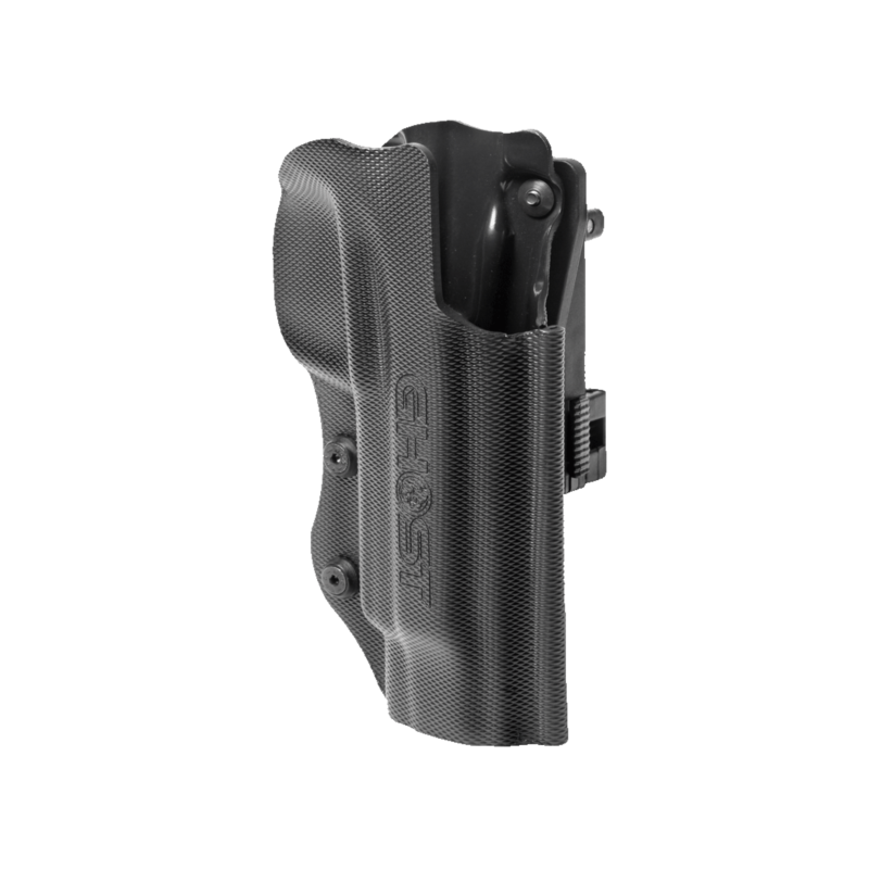 Se incluyen anclajes de cinturón alto apto para cinturones de 3,5-5 cm y paddle. El anclaje tipo paddle permite el uso de la funda sin cinturón.