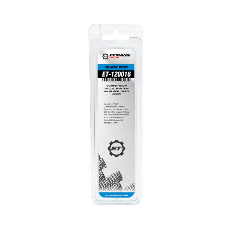 Eemann Tech está diseñado para los modelos Glock 19 y 23 Gen5, con un tamaño máximo disponible de varilla guía y un resorte de retroceso de competición clasificado en 12 libras.