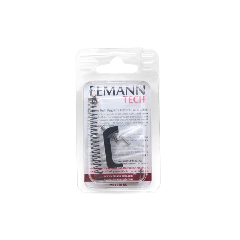 El kit de actualización Eemann Tech para GLOCK Gen5 está diseñado para aligerar la presión del gatillo y extender el retén del cargador, lo que mejora la velocidad de recarga. Este kit es compatible con las GLOCK 17, 22, 34, 35 (Small Frame) GEN5, GLOCK 19X y modelos similares, e incluye varios componentes que modifican la presión y el rendimiento del gatillo. Ideal para tiro de competición, incluye piezas que pueden afectar el seguro del gatillo.