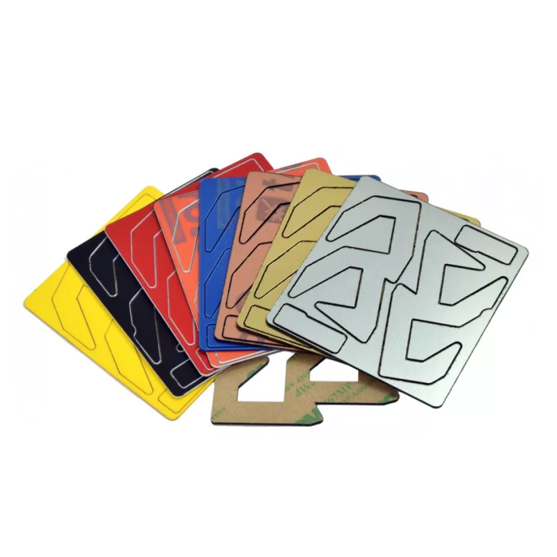 Vienen dos logos, tanto para la izquierda como para la derecha. Tenga en cuenta que estas incrustaciones tienen una película protectora transparente en la parte frontal y una cubierta de cinta adhesiva de 3 m en la parte posterior. Ambos deben despegarse antes de la instalación.